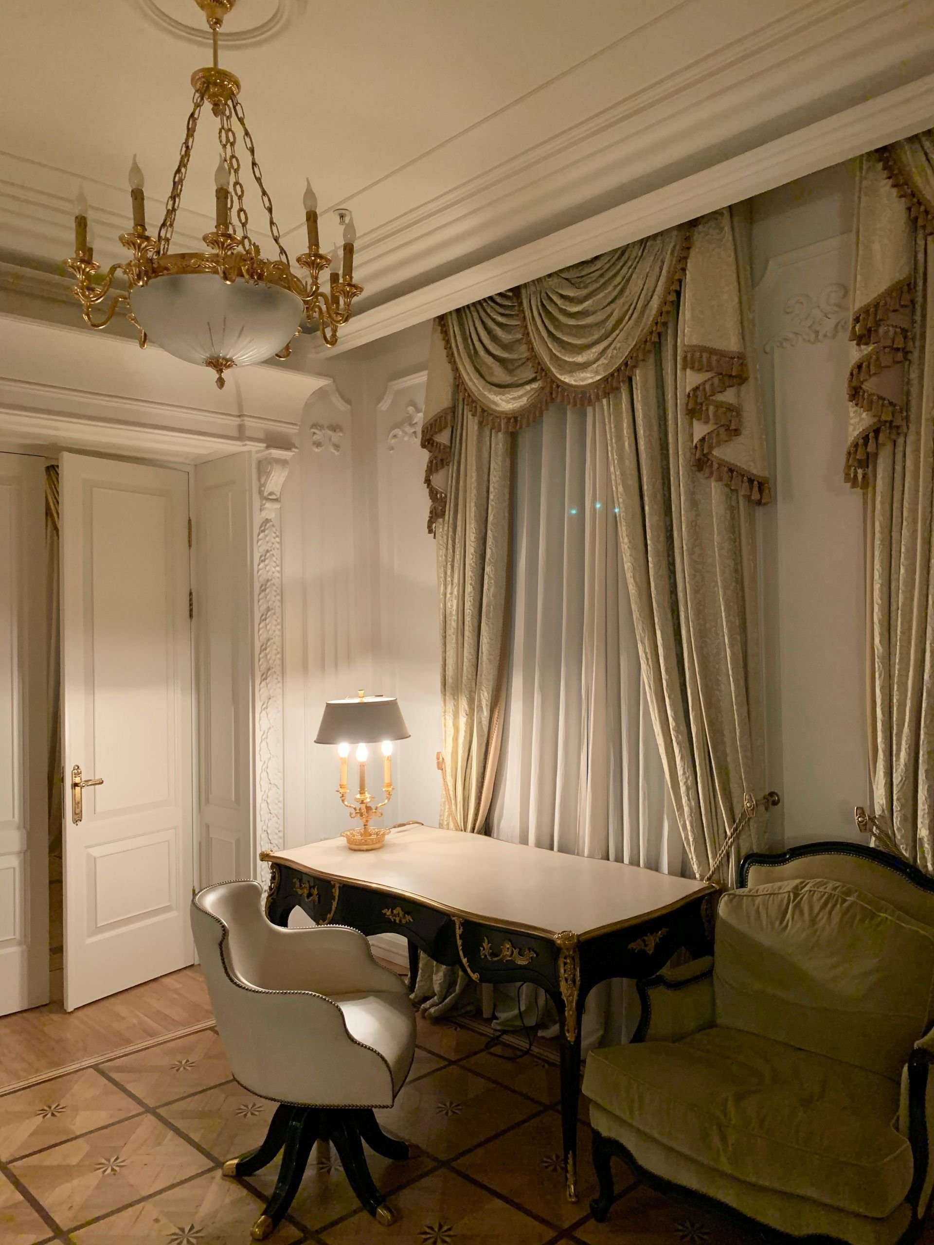 A private elevator takes you up to the penthouse floor and our grandest suite. Bright and airy rooms with marble floors, towering columns and streams of natural light are contrasted with the intimate elegance of the wood panelling and cozy furnishings in the study and media room.